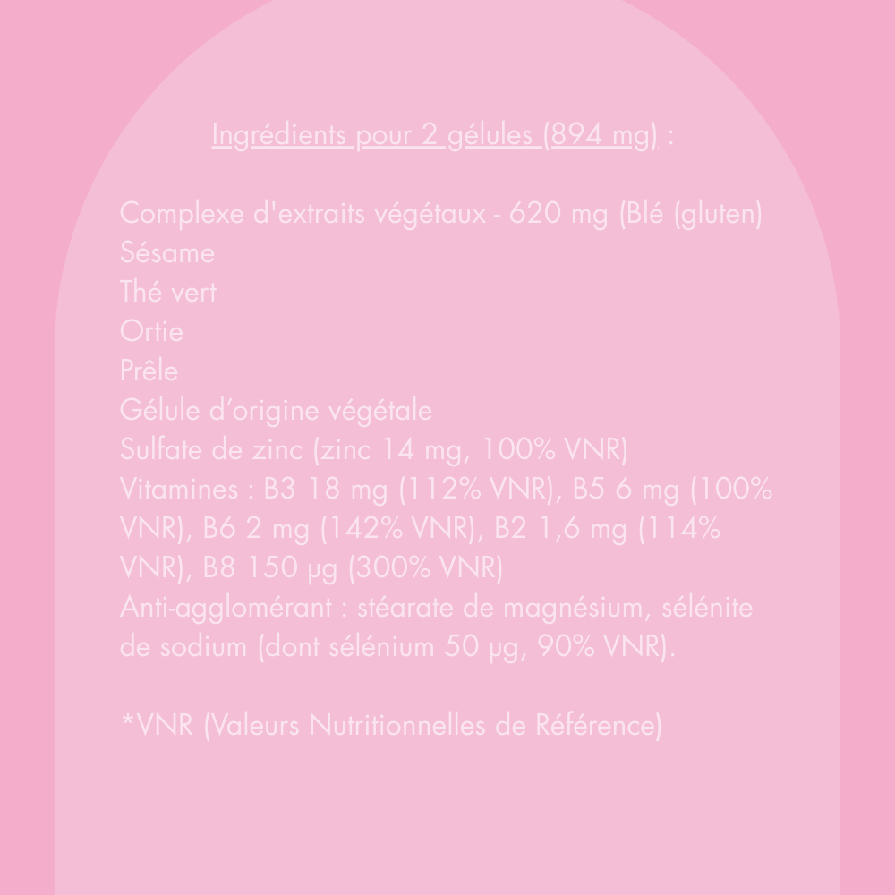 Biotine (Vitamine B8) â contribue au maintien normal des cheveux et des ongles.